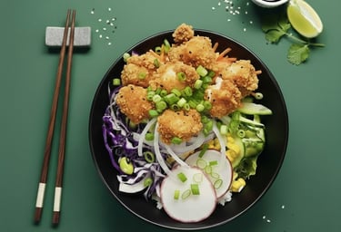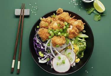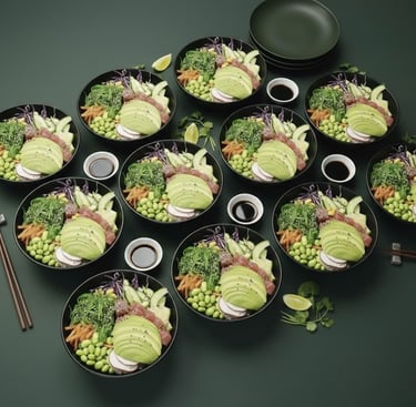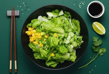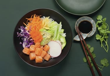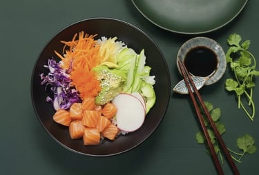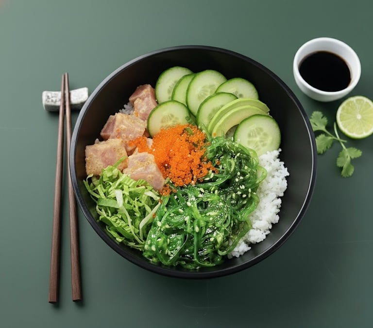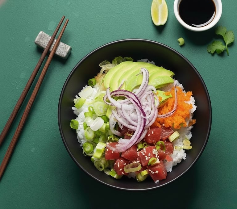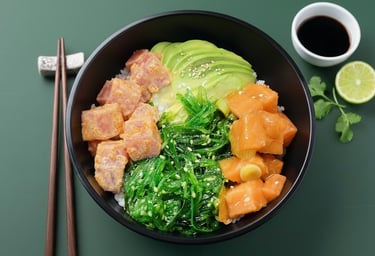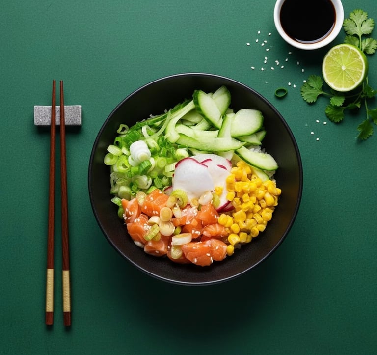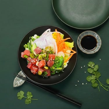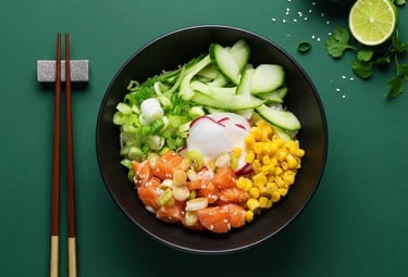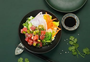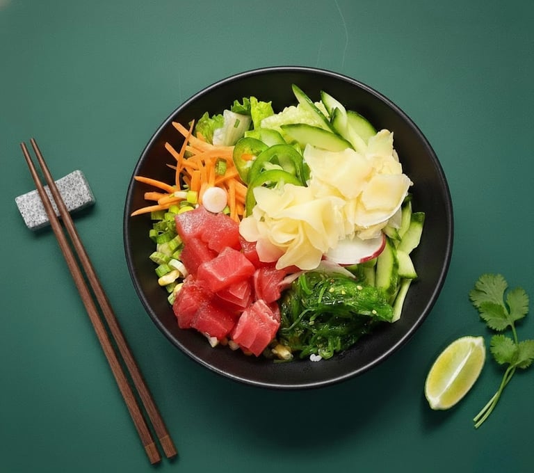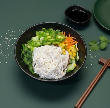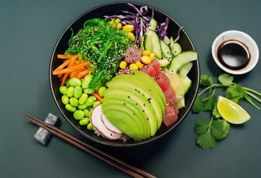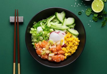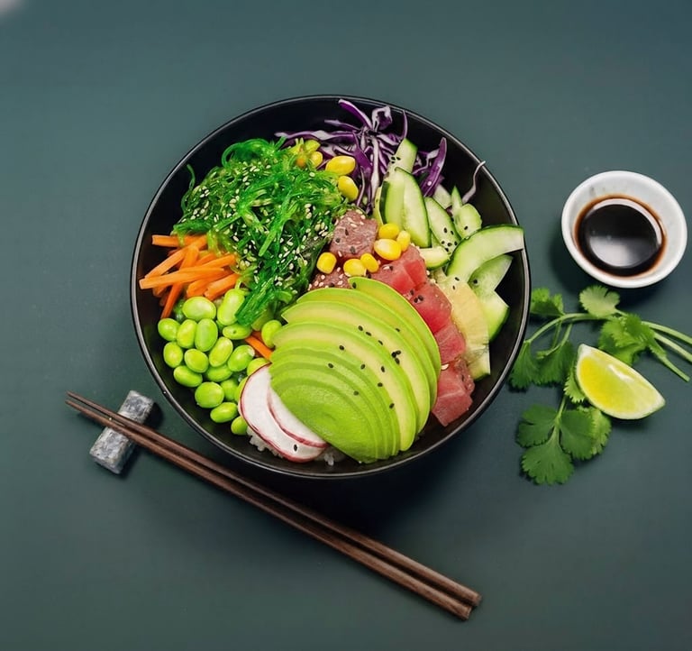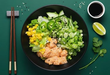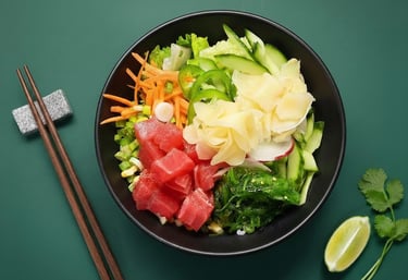 Salad + Sushi Rice + *Ahi Tuna + Avocado + Beans + Cucumber + Masago + Lettuce + Corn