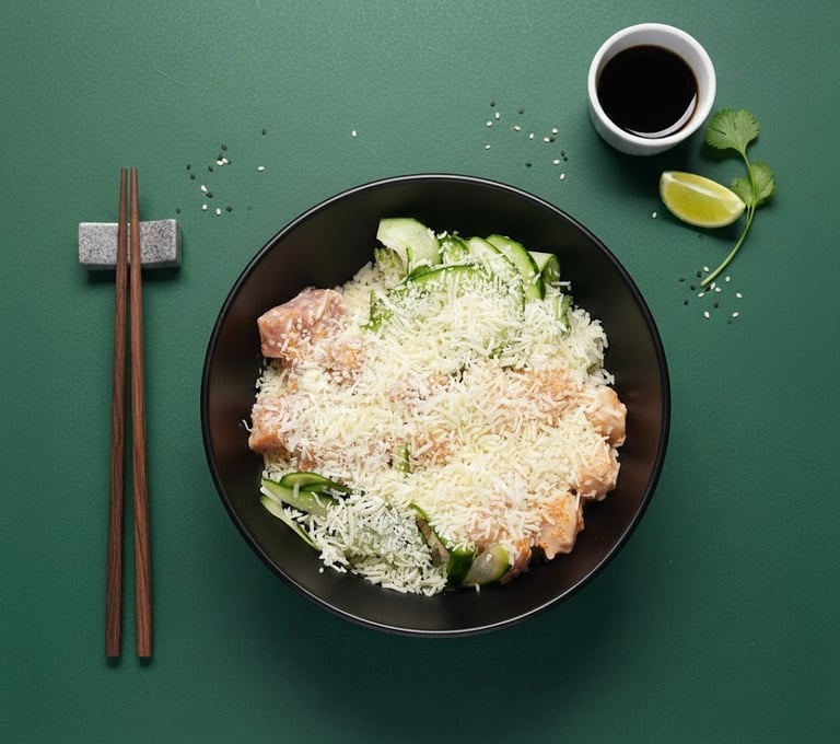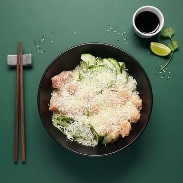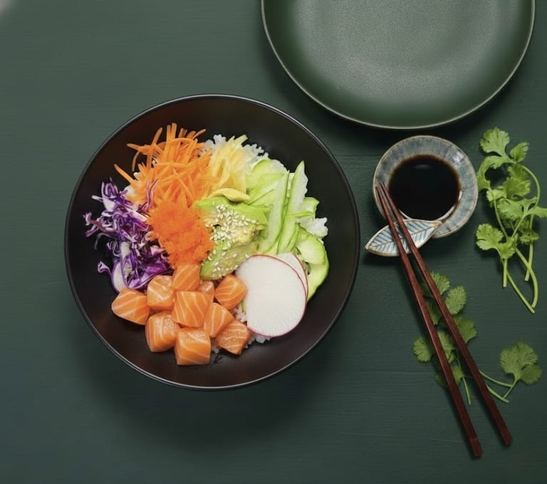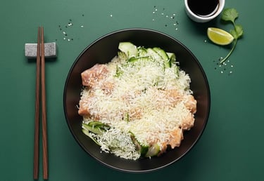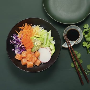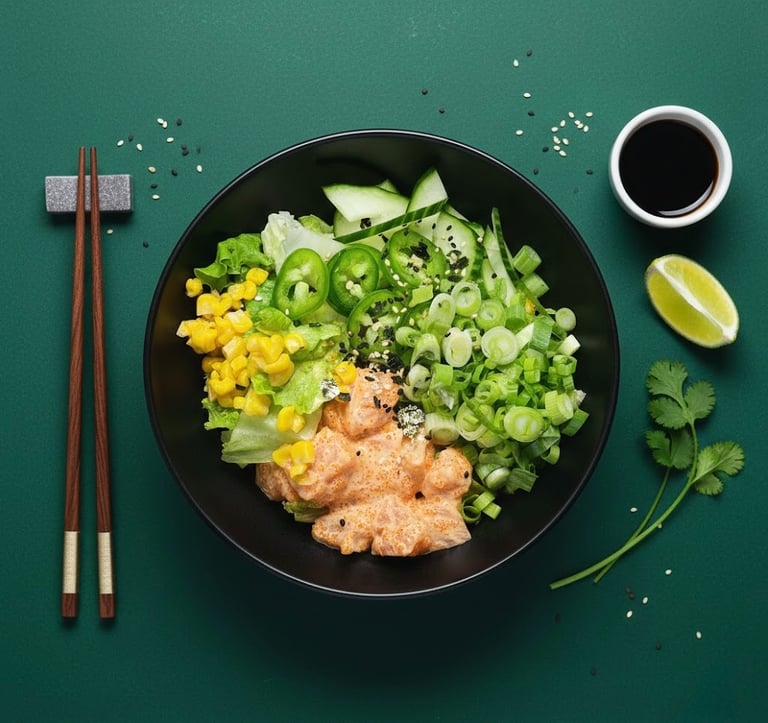 Sushi Rice + Spicy Salmon + Furikake + Lettuce + Cucumber + Green Onion + Ginger + Masago